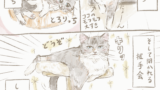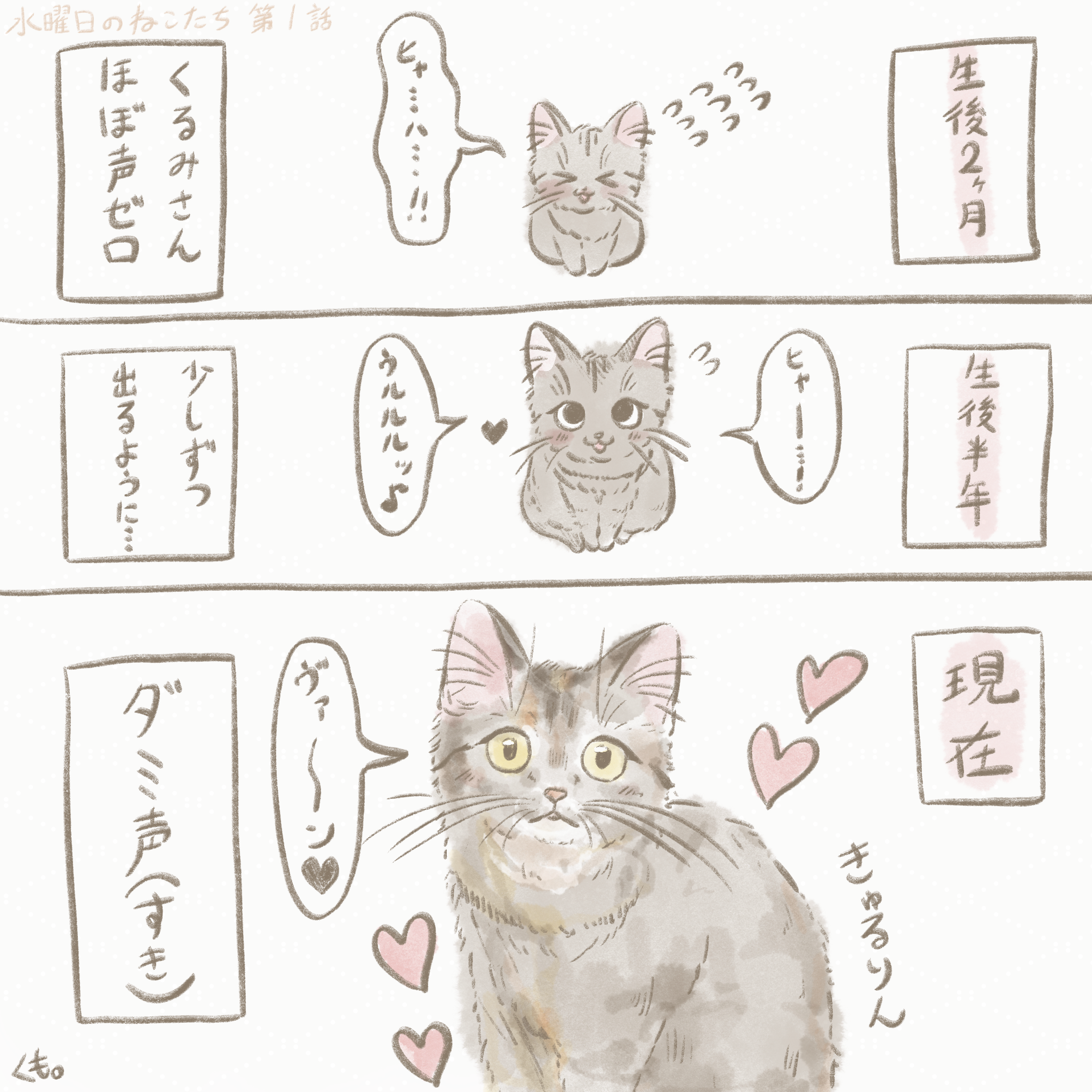 水曜日のねこたち第1話 水曜日のねこたち 2026.03.042026.03.12 水曜日のねこたち 第1話 毎週水曜日にくるみもち家のプチ漫画をお届けします。 まずは長女のくるみさんからスタートです。 生後2ヶ月くらいでうちに来たくるみさん。 当時はほとんど声が出ていませんでした。 しかし、成長するにしたがってだんだん声が出るように・・・♡ 今では「ヴァー!」とか「ン゛ワ゛〜!」とか、素敵なダミ声を聞かせてくれます。 たまに綺麗な声で「ンヤーン♪」と鳴いてくれます。 どんな声も最高にかわいくてだいすきです。 第2話はおもちさんのお話・・・♪ 第2話»